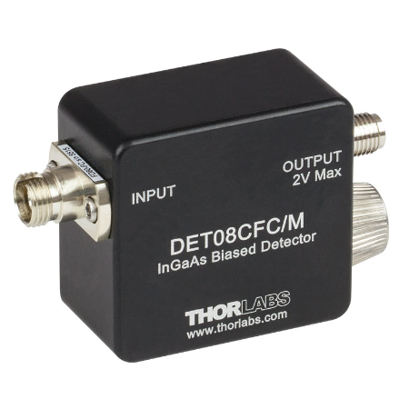 Thorlabs 型号DET08CFC/M 光纤耦合InGaAs探测器 DET08CFC(/M)设计用于800到1700 nm光谱范围。它使用InGaAs探测元件,带宽5GHz。它具有一个FC/PC输入接头,但从我们的测试来看,使用FC/APC光纤跳线没有可测量的性能差异。8-32螺纹安装孔(公制为M4)兼容我们的Ø1/2英寸接杆。