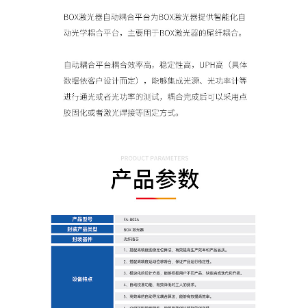 BOX激光器自动耦合平台为BOX激光器提供智能化自动光学耦合平台,主要用于BOX激光器的尾纤耦合。