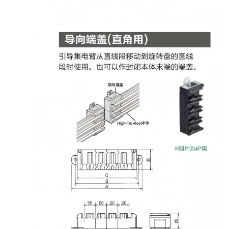 # 松下后向45°导向端盖DH5653/DH5654/DH5655/DH5656 产品说明(含锆晟平替方案) 松下DH5653/DH5654/DH5655/DH5656是HIGH - TRO - REEL非张力型滑触线专用后向45°导向端盖,核心用于3/4/5/6极滑触线的终端封闭与集电臂后向45°转向导向,适配仓储堆垛机、AGV、穿梭车、摆渡车等设备的曲线 - 曲线换轨/过渡场景,保障集电臂平稳