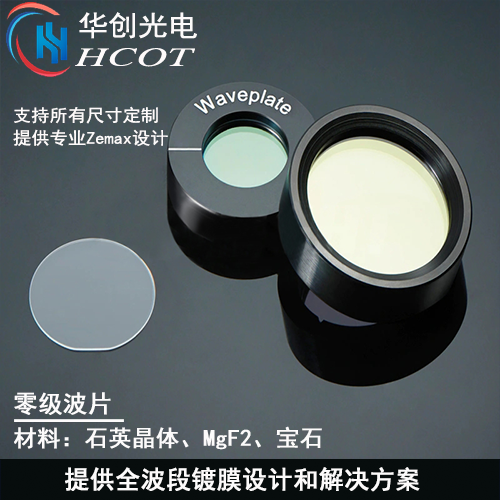 华创光电生产各种材料和尺寸规格的胶合型零级波片,常用的材料有K9、熔石英、 氟化镁、氟化钙等。同时,还可以提供各类光学镀膜。