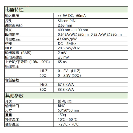 苏州因确匹电子科技有限公司自主研发和生产的PDA005B-VIS 光电探测器是一种额定带宽,固定增益的光电探测器,用于检测从直流到 5MHz 的光信号。在高阻抗载荷下最大可输出 5V 电压信号,在 50Ω阻抗载荷下最大可输出 2.5V 电压信号。能测量 400nm到1100nm 波长范围的光信号。本产品采用低噪声设计(0.7mV RMS噪声)。并附带两种螺纹接圈,分别适合于工业应用和科研应用场景。