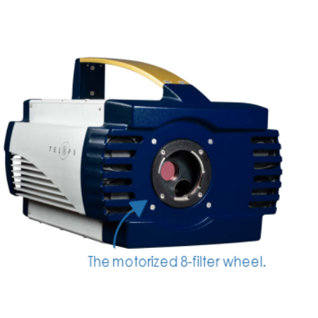 MS-IR 红外热像仪可以将场景目标通过八个光谱通道成像,而不是只生成一个宽波段的图像从而实现了目标光谱的特征分析。滤片轮是一个快速旋转的机械装置,旨在最大限度地提高热像仪的采集速率, 可设定固定或旋转模式. 旋转模式下的旋转速度用户可调整最高帧频是100 Hz, 从而使得八通道的最高帧率可达 800 fps。