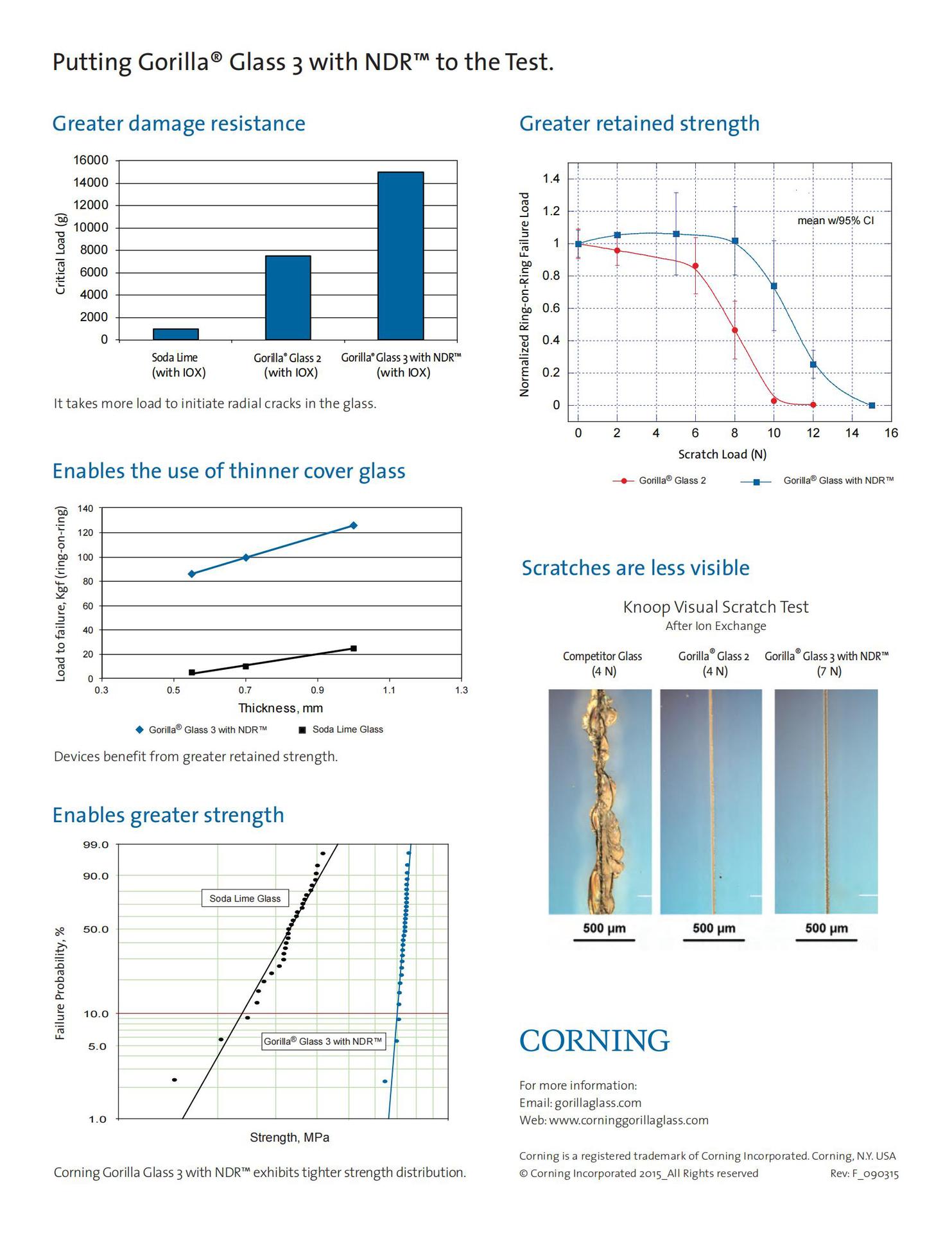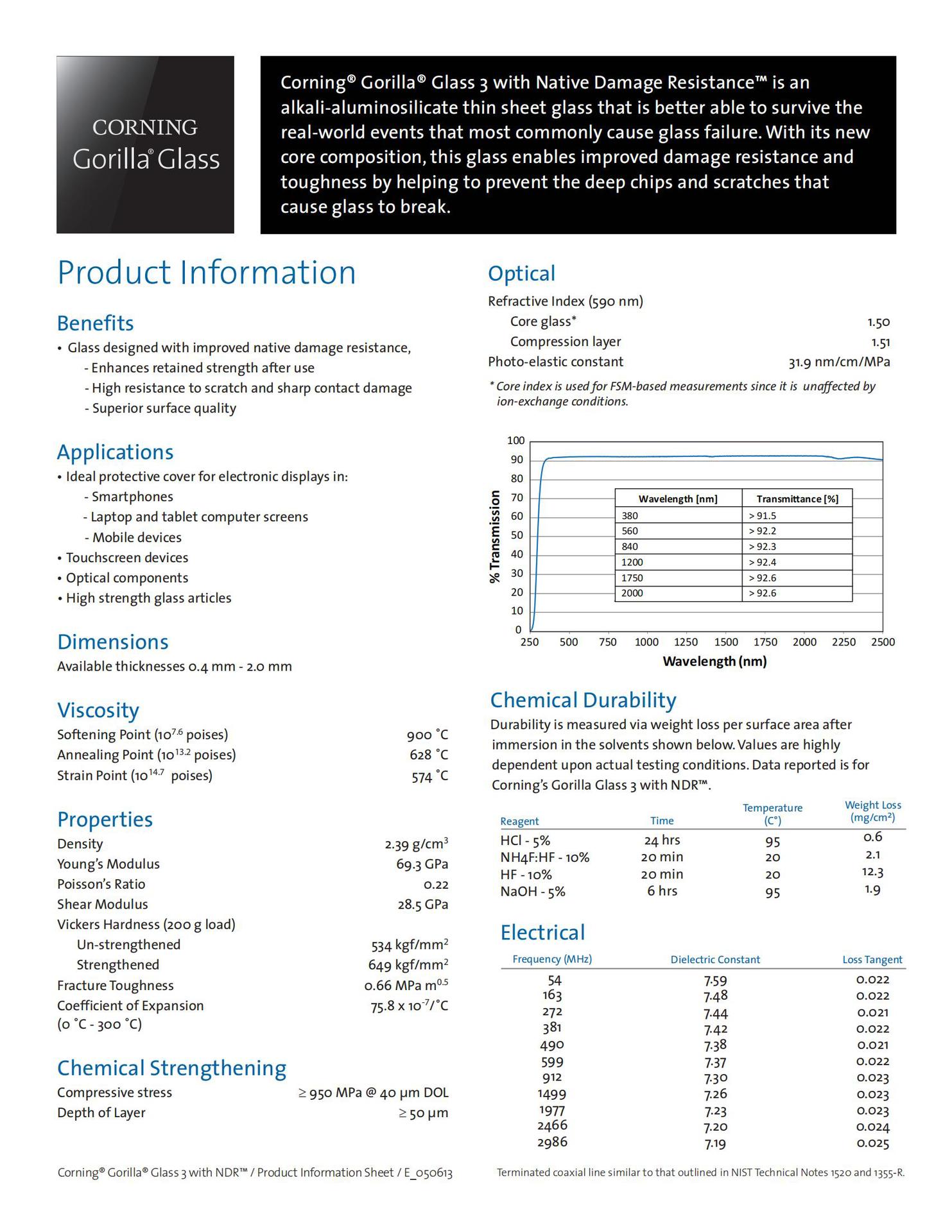 Gorilla® Glass经由康宁公司专有的熔融制程生产,具有与公司其他高科技显示基板同等的表面质量。另外,该产品也不含重金属,所以对环境无害。Gorilla® Glass可以适用于RF应用,良好的透光度使其适用于HD和3D电视的应用。
