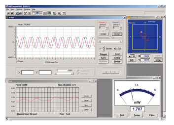 Additionally, one can activate the Plot or Chart functions, in order to observe strip-chart type plots of either Power versus Time, or XY Position versus Time, with auto scaling and saving capabilities. The Scope function enables presentation of real time oscilloscope type display of beam Position deviations (or Power fluctuations) versus Time.