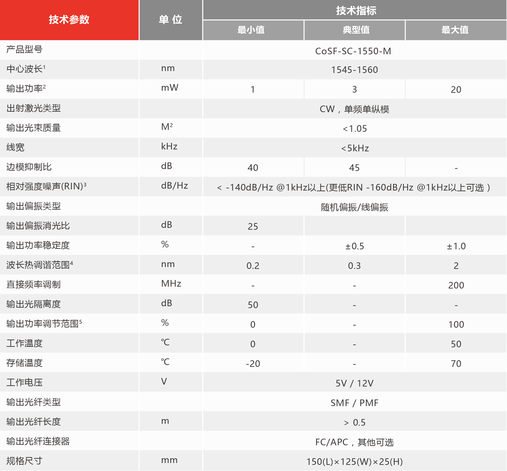 • 超低相对强度噪声< -140dB/Hz @1kHz以上 (< -160dB/Hz @1kHz以上可选)