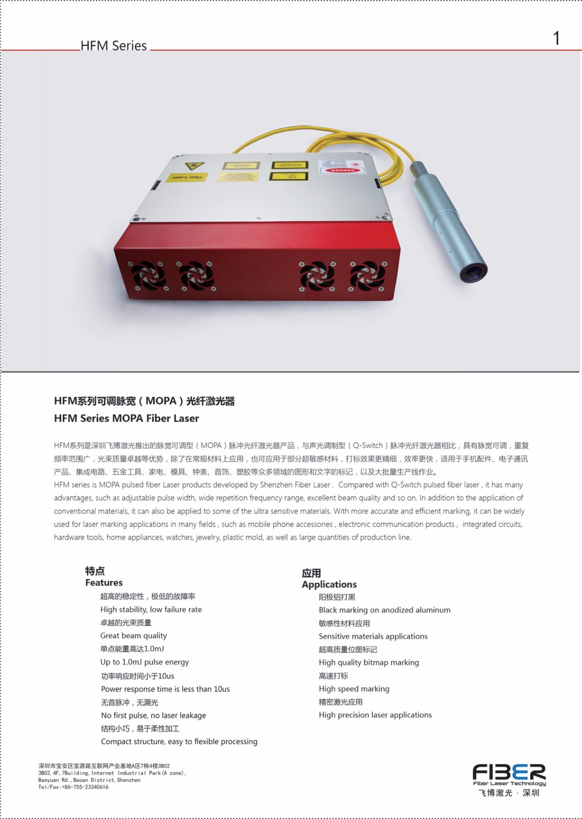 深圳市飞博激光科技有限公司成立于2014年1月,是一家专注于光纤激光器技术并致力激光器研发的高新技术企业。15年开始自主品牌激光器的研发与销售。16年3月份成功推出可调脉宽20W/30W/50W脉冲光纤激光器(MOPA Fiber Laser),17年6月份推出500W/800W/1000W连续光纤激光器(CW Fiber Laser),同时推出高端的激光扫描系统,涵盖打标、切割、焊接等应用,尤其适用于高端激光自动化设备。
