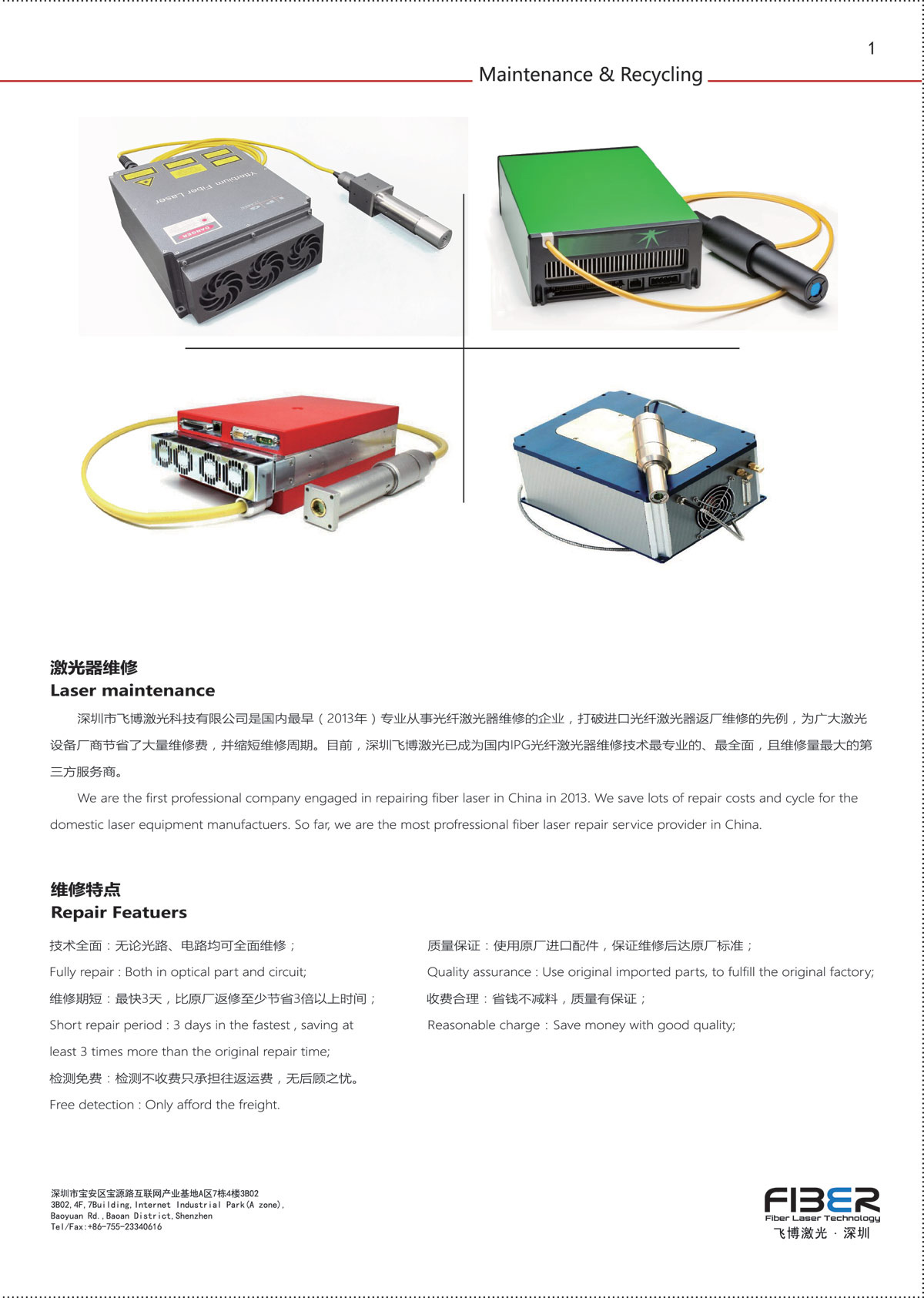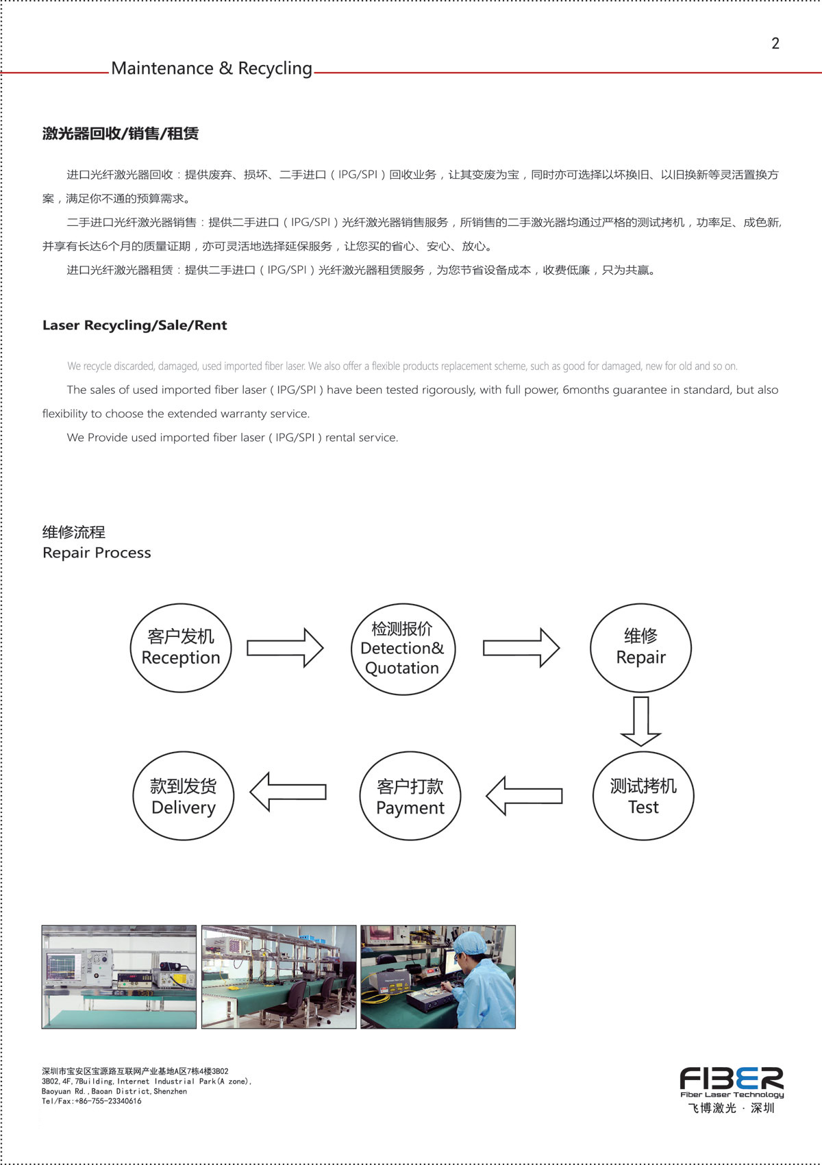 深圳市飞博激光科技有限公司成立于2014年1月,是一家专注于光纤激光器技术并拥有激光器研发能力的高新技术企业。深圳市飞博激光的成立打破了进口光纤激光器只能返原厂维修的惯例,成为国内首家专业维修进口光纤激光器的服务商,不但为国内激光设备厂商节约大量维修成本,也大大缩短了维修周期。迄今为止,深圳市飞博激光科技有限公司是国内最专业、维修量最大的IPG光纤激光器维修服务商。