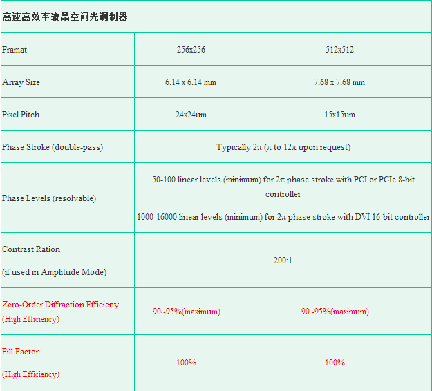 BNS公司采用独特的Dielectric Mirror Coating的技术,成功地将填充因子提高至100%,从而将光的能量利用效率(zero-order)提高至90%~95%,同时这一技术还能够改善反射波前畸变这一指标。基于此,我们提供一款高速高效率纯相位液晶空间光调制器。该产品的综合性能最强,其在调制速度、光能利用率、反射波前畸变等方面均有较高的性能指标。