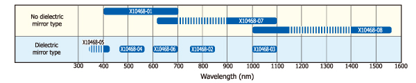 X10468共有8种标准型号可供选择。X10468-01/-07/-08不带有介电反射镜,但具有高衍射效率并覆盖了更宽的读出光的波长范围。X10468-02/-03/-04/-05/-06带有用于特定波长的介电反射镜。Figure 1展示了这些型号的光谱响应特性。由于反射损耗,X10468-07的700nm-900nm波段和X10468-08的1150nm-1400nm波段将出现多余的干涉噪声。400nm以下的紫外光将对X10468-05造成损坏。更多细节请于我们联系。滨松集团生产OEM器件满足您对355-1550nm波段的需求。我们能够根据您的应用需求中的光波长对器件进行设计和优化。