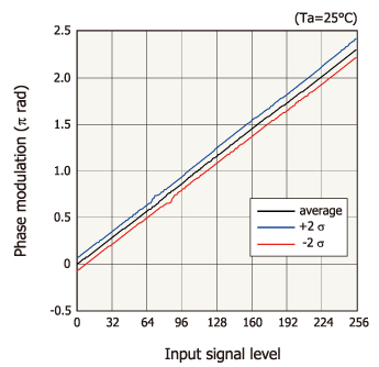 X10468系列能在400-1100nm读出光波段实现2π以上的位相调制。X10468出厂前就对特定波长进行了校准,使其达到2π以上的位相调制和良好的线性特性。Figure 2 展示了典型的位相调制特性。2π及以上的位相变化和线性位相响应得以实现。95%像素的相位调制曲线在+/- 2 σ范围内。