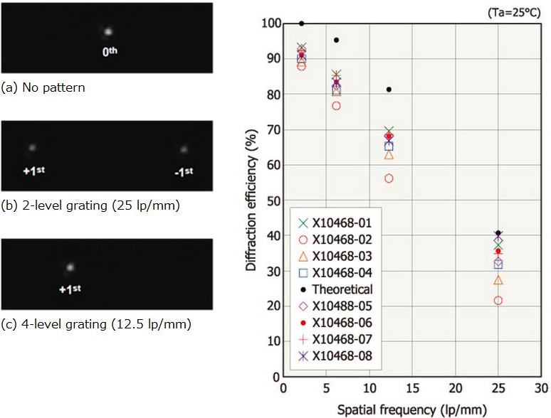 X10468系列是高精度相位控制的纯相位空间光调制器。因此它具有接近理论值的高衍射效率。Figure 3 展示了多阶相位光栅构建在X10468中的衍射斑的图像, Figure 4 展示了典型的衍射效率特性。这里衍射效率定义为I1/I0,I1是无图样加载时一级衍射斑的光强,I0是零级光强。