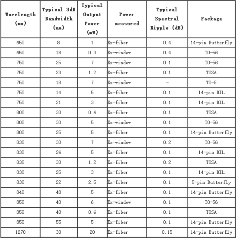 EXALOS提供各种类型的标准超辐射发光二极管(SLEDs), 波长范围从650nm到1700nm, 多种输出功率、带宽与封装形式,包括冷却型的蝶形封装、低成本的非冷却型TOSA与TO-56封装。除了我们的标准产品之外,EXALOS还能根据客户要求的光学性能与封装形式或光纤种类提供定制型的SLED产品。