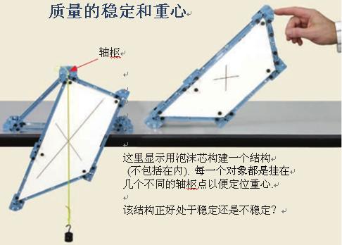 这里显示用泡沫芯构建一个结构(不包括在内)。每一个对象都是挂在几个不同的轴枢点以便定位重心。该结构正好处于稳定还是不稳定?