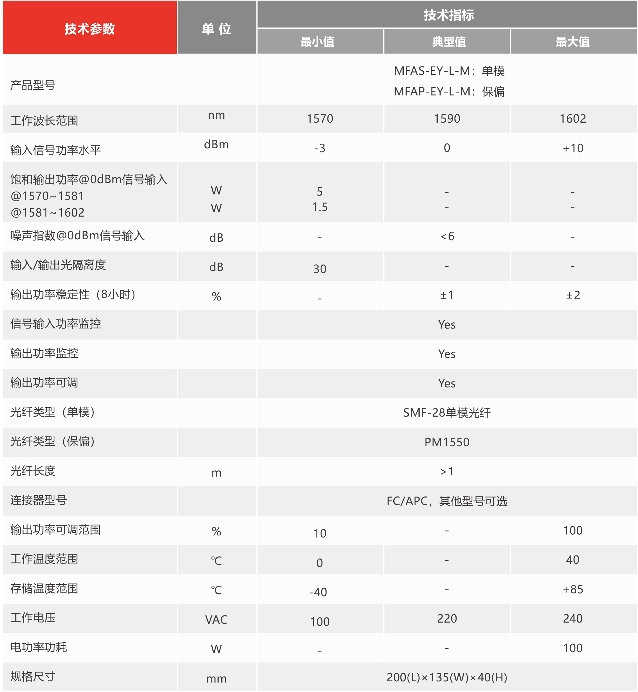 上海瀚宇研制生产的MARS系列L-Band高功率光纤放大器模块,内部采用了高功率、高性能的多模泵浦源,运用双包层光纤放大技术,全光纤结构的一体化设计,输出功率@1570~1581可达1.5W,@1581~1602可达5W。MARS系列光纤放大器是一款完整的Turn-Key系统,内部采用微处理器控制,通过前面板的LCD实时显示泵浦电流、温度等工作状态,并能及时提供报警信息,界面清晰,操作简便。