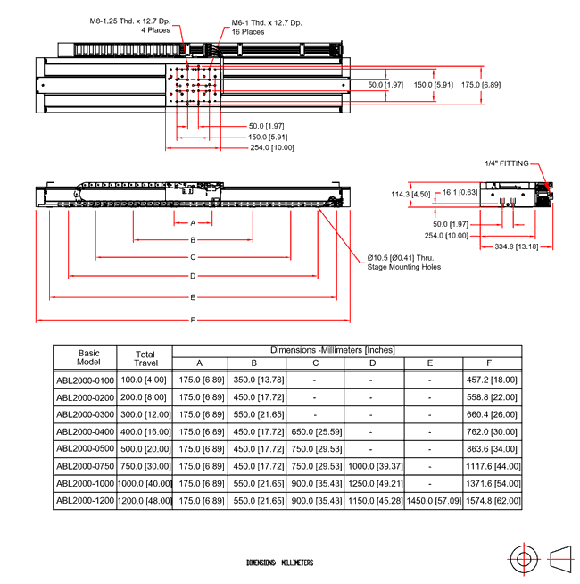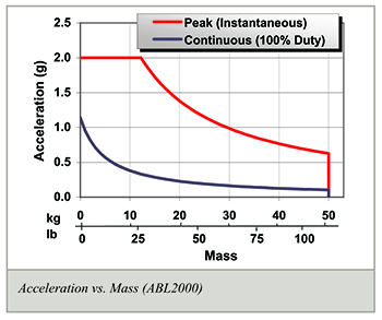 Mechanical Specifications ABL2000-0100 ABL2000-0200 ABL2000-0300 ABL2000-0400 Total Travel 100 mm 200 mm 300 mm 400 mm Motor Type Linear Brushless Servomotor Bus Voltage 80 VDC Feedback Noncontact Linear Encoder Maximum Speed(1) 2 m/s Maximum Acceleration 2 g (No Load) Maximum Load(2) 50.0 kg Accuracy -E1 Encoder Calibrated(3) ±0.5 µm ±0.75 µm Standard ±4.0 µm ±8.0 µm ±11.5 µm ±14.0 µm -E4 Encoder Calibrated(3) ±0.5 µm ±0.75 µm Standard ±5.0 µm Repeatability -E1 Encoder ±0.2 µm ±0.3 µm -E4 Encoder ±0.2 µm ±0.3 µm Straightness and Flatness Maximum Deviation ±0.25 µm ±0.40 µm ±0.75 µm ±1.5 µm Pitch/Roll/Yaw 1 arc sec 2 arc sec 3 arc sec 4 arc sec Nominal Stage Mass 30.0 kg 34.5 kg 39.5 kg 44.0 kg Operating Pressure(4) 80 psig ±5 psig Air Consumption(5) 19.8 SLPM (0.7 SCFM) (Single Axis) Moving Mass 9 kg Material Aluminum Finish Hard Coating (62 Rockwell Hardness) Mechanical Specifications ABL2000-0500 ABL2000-0750 ABL2000-1000 Total Travel 500 mm 750 mm 1000 mm Motor Type Linear Brushless Servomotor Bus Voltage 80 VDC Feedback Noncontact Linear Encoder Maximum Speed(1) 2 m/s Maximum Acceleration 2 g (No Load) Maximum Load(2) 50.0 kg Accuracy -E1 Encoder Calibrated(3) ±0.75 µm ±1 µm Uncalibrated ±15.75 µm ±18.5 µm ±20.0 µm -E4 Encoder Calibrated(3) ±0.75 µm ±1 µm Uncalibrated ±5.0 µm Repeatability -E1 Encoder ±0.3 µm ±0.4 µm -E4 Encoder ±0.3 µm ±0.4 µm Straightness and Flatness Maximum Deviation ±2.0 µm ±3.0 µm ±4.0 µm Pitch/Roll/Yaw 5 arc sec 7.5 arc sec 10 arc sec Nominal Stage Mass 49.0 kg 61.0 kg 72.5 kg Operating Pressure(4) 80 psig ±5 psig Air Consumption(5) 19.8 SLPM (0.7 SCFM) (Single Axis) Moving Mass 9 kg Material Aluminum Finish Hard Coating (62 Rockwell Hardness)
