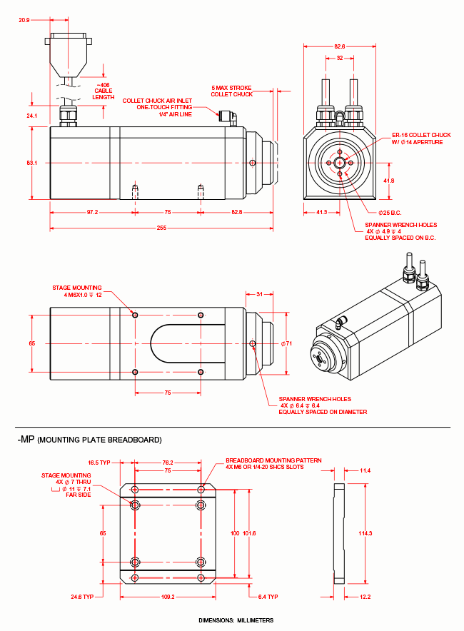 800 rpm (-SS)Tube Capacity 14 mm (shaft aperture) with max. 10 mm Collet ID Maximum Torque (Continuous) 2.3 N·m Load Capacity(2) Axial 3.0 kg Radial 2.0 kg Moment 3 N·m Rotor Inertia (Unloaded) 0.0006 kg·m2 Stage Mass 4.9 kg Collet Type(3) ER16 Collet Runout(4) <25 µm Minimum System Air Pressure(5) 100 psig Material Electroless Nickel Aluminum; Stainless Steel Collet Chuck MTBF (Mean Time Between Failure) 10,000 Hours Electrical Specifications