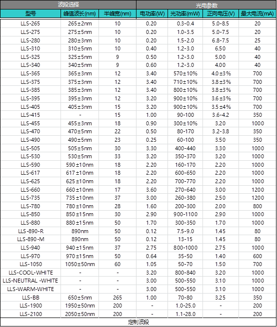LED光源是基于不同客户要求定制的一系列激发光源,辰昶仪器LED光源产品系列多,可以涵盖从紫外波段(265nm)到近红外波段(2100nm),也可以根据客户要求定制不同波段的LED光源。