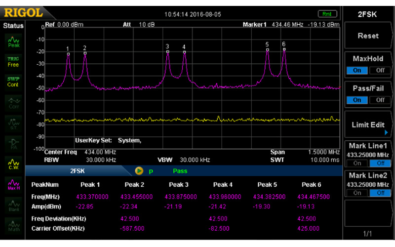 汽车遥控钥匙,TPMS胎压模块及小无线模块等通常使用ASK/FSK调制。DSA700可通过SSC-DSA功能扩展来完成ASK/FSK信号的抓取,并且内置2FSK测试功能,可直接获取其中心频率、功率及偏移等参数。