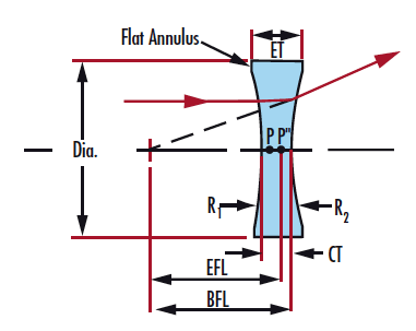 双凹镜片(DCV)两面都为凹面,焦距为负,可用于缩小图象,发散光束等。所有尺寸都是毫米为单位。