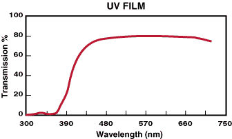透明柔韧聚酯滤波片,特殊的镀膜来吸收紫外线。特殊的材料允许390nm波长以下有小于10%的透过率,0.04mm厚度。