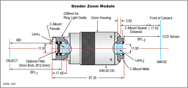 这种4:1变倍模组与其它镜头能够组合成比较广泛的变倍系数和工作距离,通过两个附加的直径为12.5mm的复消色差透镜就可调节放大倍率(不包括此透镜)。镜头前后都为C接口,可选环形光接在镜头前端照明,此处可固定直径12.5mm、厚度3mm的滤光片。