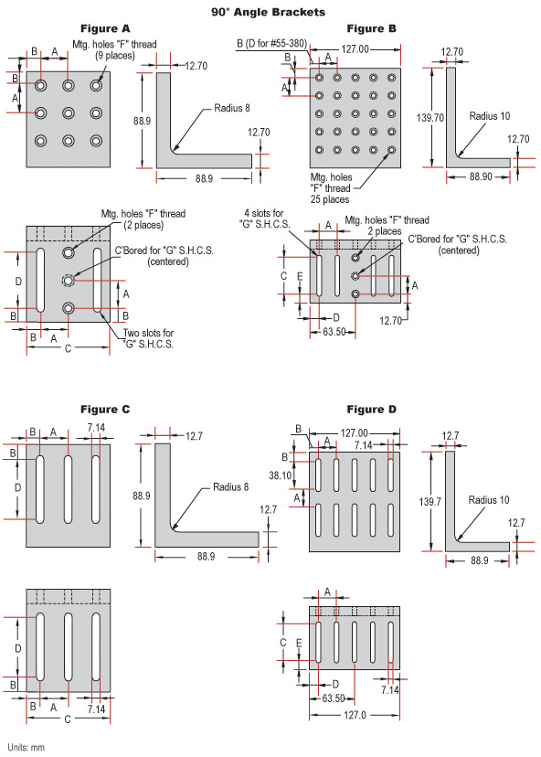 可选公制和英制标准,本品可与旋转台、平移平台、光学夹具和其它定位装置配合使用,将实验板转换90°。本撑架可与¼英寸螺钉或M6的螺钉连接,取决于您选的型号。普通K款的角撑架只有开口槽(无螺纹孔),即使公制还是英制都没有。小款的型号在两面有3个2英寸长的开口槽;大尺寸款的在底面有5个2英寸长的开口槽,大端面有10个1-½英寸长的开口槽(5排,中心距为1英寸),具体见附图。.