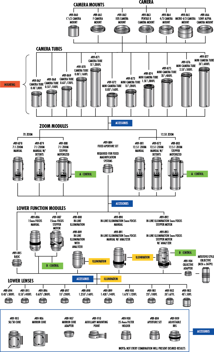 7X与12.5X高精度微距镜头为模块化镜头系统,内含相机接口、摄像管、核心模块、底部功能模块与底部镜头。可通过切换模块以改变放大倍率、视场或光学通道,从而增加其多功能性。7X与12.5X高精度微距镜头与M26 x 36 TPI Mitutoyo型物镜相兼容,同时也与适用于C接口至F接口至35mm DSLR相机的相机传感器覆盖与固定座相兼容。备有50/50与 90° 棱镜以引进直角转动或支持多个成像路径。同时也备有适用于多轴微距和聚焦功能的电动控制器,并可连接至USB、以太网或RS-232/422/285端口。