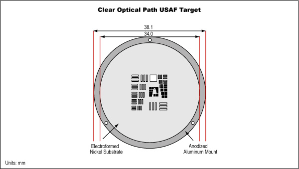 透射光路测试板是采用电铸工艺制作在很薄的镍片上去除掉多余材料。由于在图案区域没有光学材料,光线通过空气传播,这样就去除了色差和吸收问题,本测试板图案函盖了0组图,1组元到3组图,6组元。使用者手册里详细概括了各组图和组元的位置。UV熔融石英荧光测试卡(上方)可用在NUV场合,而透射光路测试板可用在远紫外以及远红外的场合。这种电铸模式的标板装在两个圆板之间,可以安装到我们的标准光学装置#64565上。