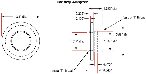 90° Angle Mount #39-355 features two ¾" thru holes at 90° with locking knobs. All Ring Mounts feature ¼-20 mounting hole, set screw for securing post, or optical component within the inner diameter. Swivel Arm #03-684 features a 0.75" diameter post which accepts rack and pinion focusing mount and allows swivel movement. Infinity Mounting Adapter #39-358 features male and female T-thread to replace 24mm tube section of infinity lens.