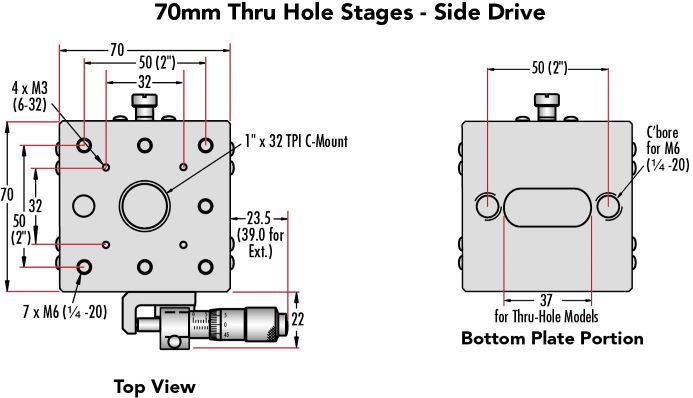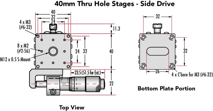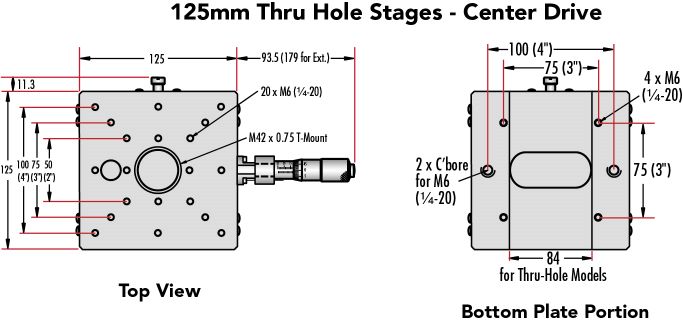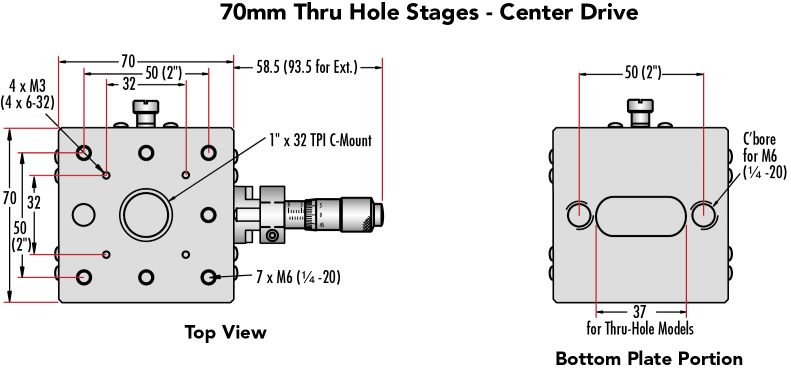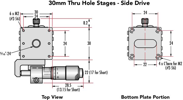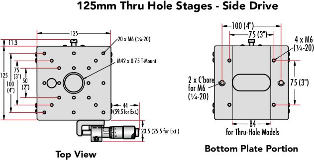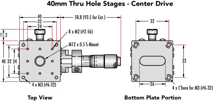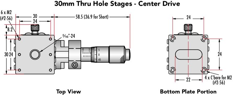通孔调整台在其顶板中心带有以下螺纹: 30mm 调整台上的 5/16"-24 螺纹用于我们的#38-534 针孔适配器, 40mm 调整台上的S接口(M12 x 0.5) , 70mm 调整台上提供 C 接口 (1”-32 TPI) , 125mm 调整台上提供 T 接口(M42 x 0.75) 以便与我们的 C-、T- 和 S- 接口套管系统组件兼容。