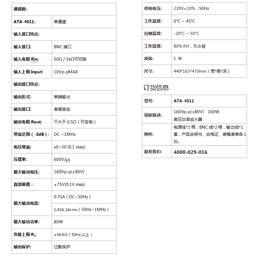 二、ATA-4011高压功率放大器规格参数: