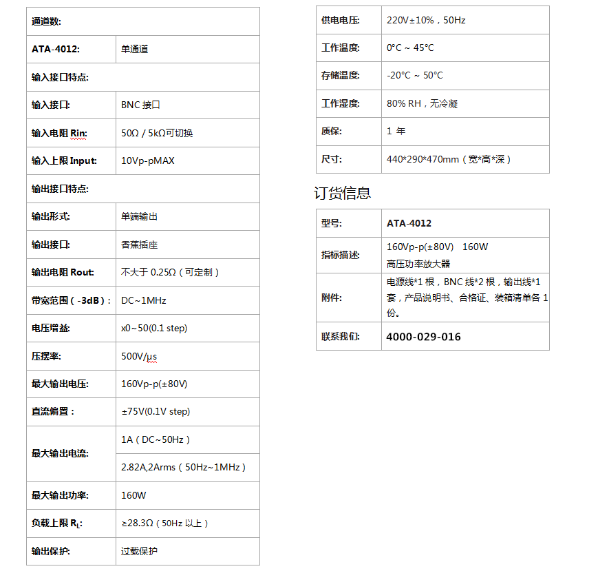 ATA-4012是一款理想的可放大交、直流信号的单通道高压功率放大器。最大输出160Vp-p(±80V)电压,160W功率,可以驱动高压功率负载。电压增益数控可调,一键保存常用设置,为您提供了方便简洁的操作选择,可与主流的信号发生器配套使用,实现信号的完美放大。
