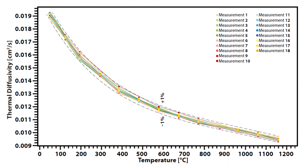 康宁的玻璃陶瓷Pyroceram作为各种应用中的标准材料,使用LFA 1000测量各项热物理性参数,显示出超高的热扩散系数重复性。8次单独测样过程使用18个同一样本不同位置切出的样品。实验结果表明,在1250°C以下温度范围内,热扩散系数值范围偏差在±1%之间。