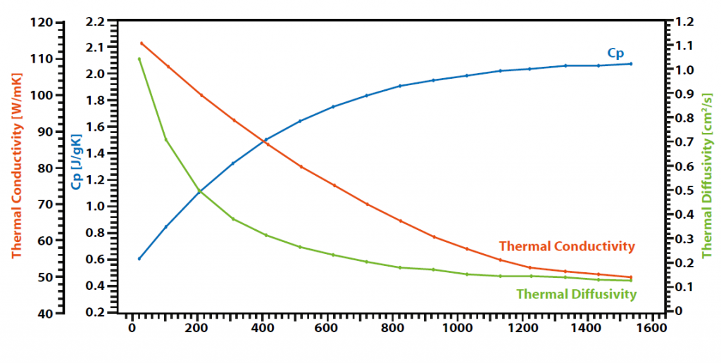 标准玻璃陶瓷(BCR 724)使用LFA 500测量得到参数。从块状材料中制备厚度为1mm、直径为25mm的小圆盘并涂覆石墨进行测量。LFA 500直接给出热扩散系数。在相同条件下,同一样品不同位置的玻璃陶瓷,用比较方式得到Cp值,利用此方法,用密度、比热和热扩散系数三者的乘积得出导热系数。结果表明,Cp值随温度升高而增加,热扩散系数和导热系数则略有下降。