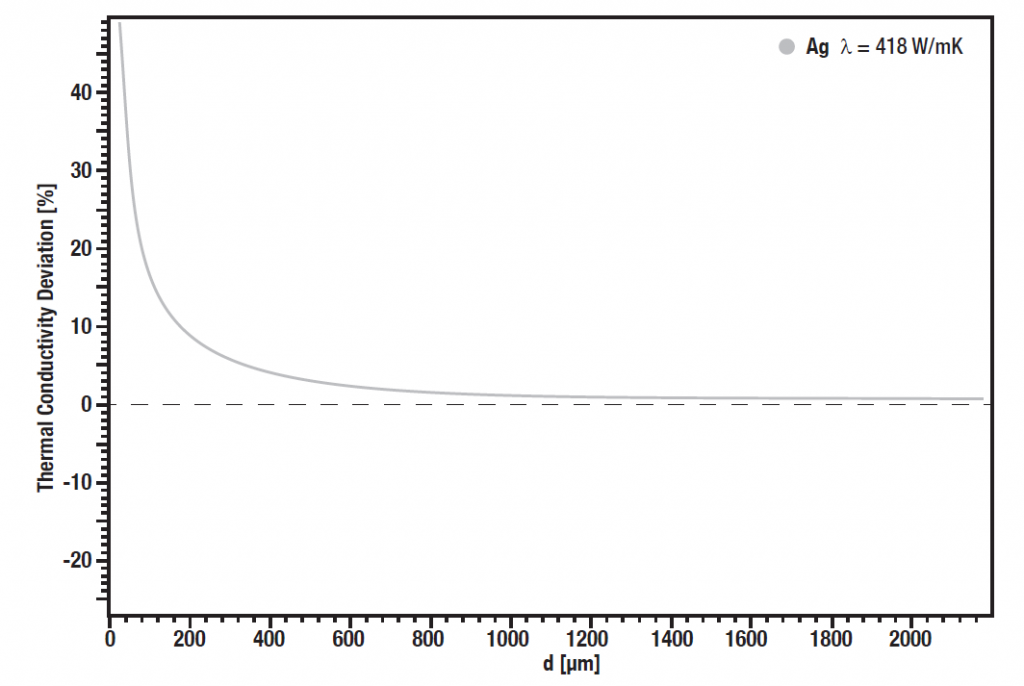 用标准银来研究样品厚度对热导率准确性的影响。在室温下测量不用厚度的标准银,从而得出激光闪射法理想的样品厚度。通过热扩散系数、密度和热容计算出导热系数。此方案显示,直径越小,精度越高(偏离文献值)。约在200微米时,精确度达到极限,并于此分界点外显著不同。然而,不仅是方法的局限性,而且也是由于薄膜材料展现了区别于如块状材料的特异性,我们使用薄膜激光导热仪或其他薄膜测量技术。