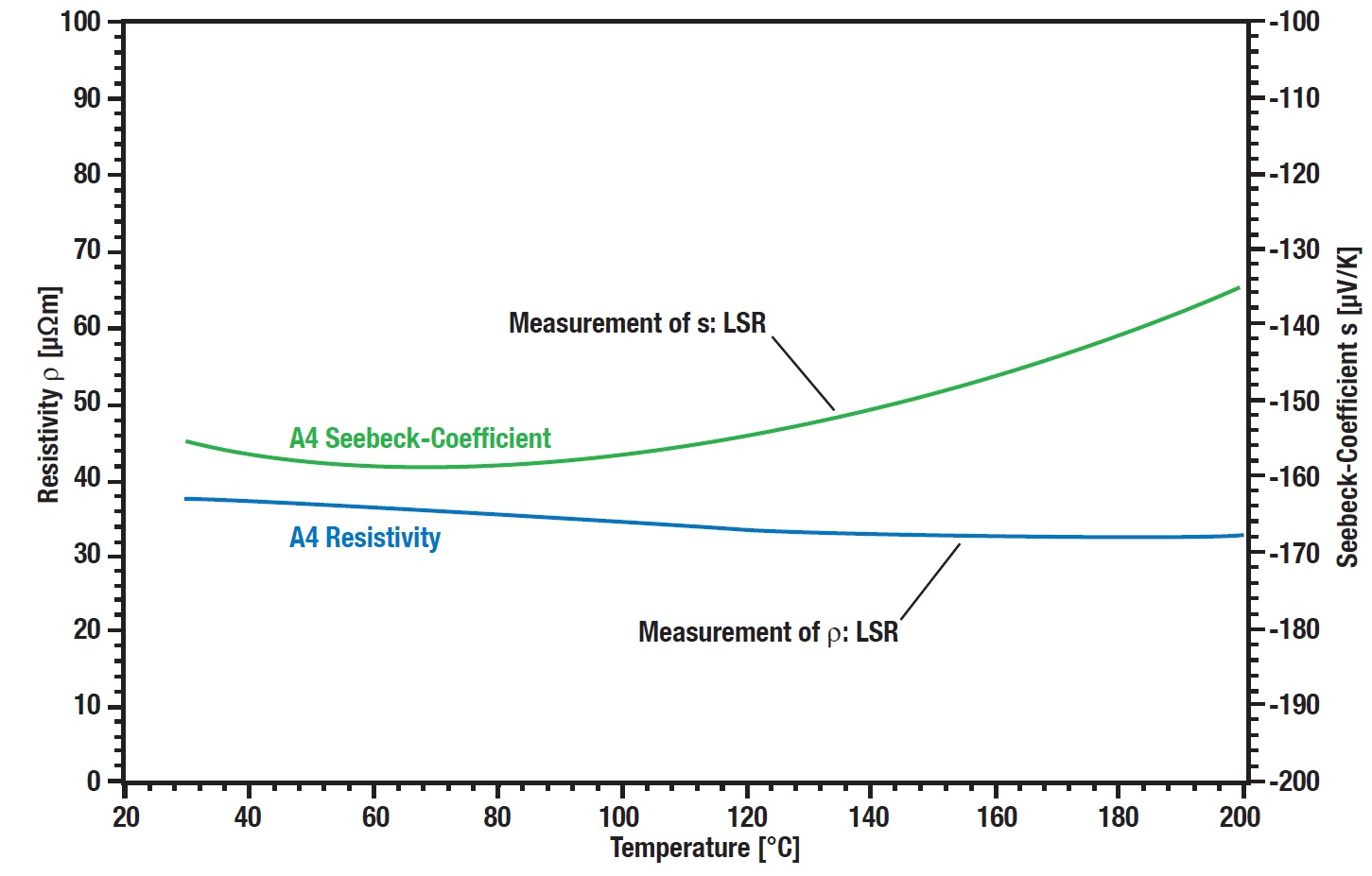 典型的含碲化合物热电材料在室温至200 ℃温度范围进行测试,电阻率和Seebeck系数在该温度区间的曲线见下图。