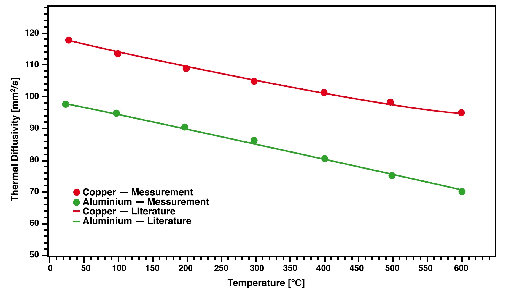 在本例中用纯金属铜和铝来证明Linseis激光闪射装置的性能。这两种材料的测定结果与文献值进行比较。测得的结果与定文献值比较差别在2%以内,体现了仪器的优异性能。