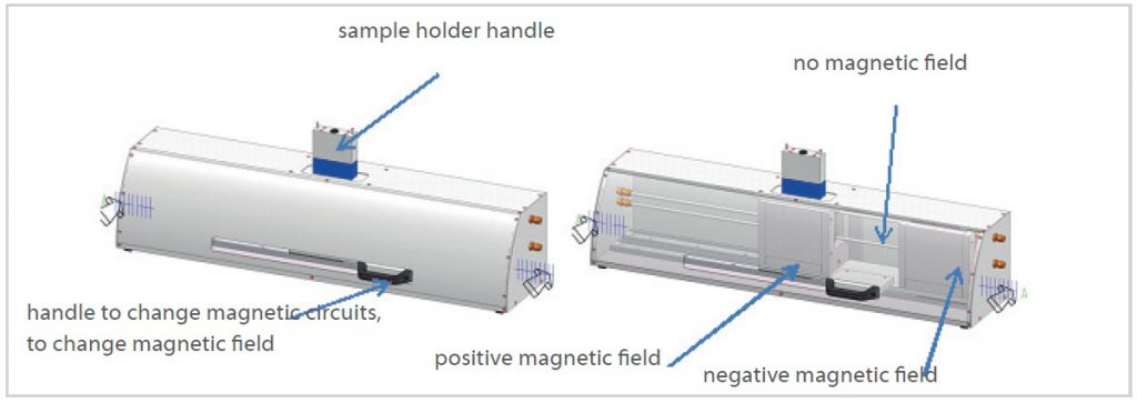 可选的实际磁场强度可以在高达150℃的温度下测量。测量过程中,在滑轨上的两个磁路可以移动组装,可将磁通量从正变为零甚至为负,因此样品无需移动。