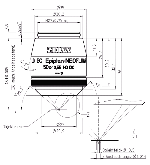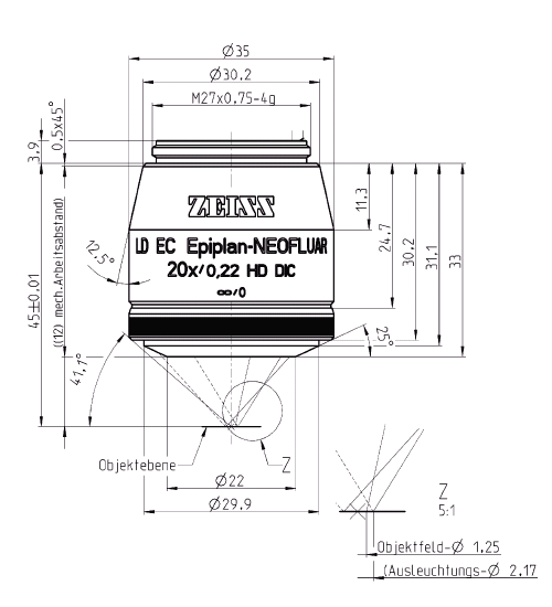 规格 | Objective LD EC "Epiplan-Neofluar" 20x/0.22 HD DIC M27 | Objective LD EC "Epiplan-Neofluar" 50x/0.55 HD DIC M27 | Objective LD EC Epiplan-Neofluar 100x/0.75 HD DIC M27 |
