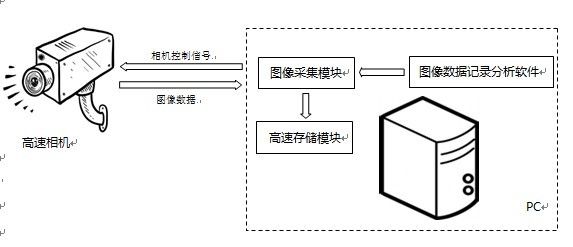 系统由高速相机、高速图像采集模块、高速存储模块和图像数据记录分析软件组成。高速相机与高速图像采集模块通过高速实时传输接口实现图像数据信号的传递和控制信号的收发,图像数据信号与来自其他外设(如GPS)的附加信息叠加后,实时保存在高速存储模块中。