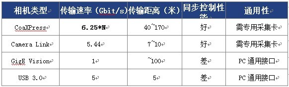 AcutEye系统支持的相机接口类型包括:CoaXPress,CameraLink,GigE Vision和USB3.0,其特性如下表所示: