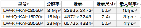 ■ 图像传感器类型:Aptina CMOS图像传感器 ■ 图像传感器型号:ASO260 1/6英寸 ■ 最大分辨率及最大帧率:1920 x 1080时30帧每秒 ■ 像素尺寸:1.4 x 1.4 μm IQ ccd传感器系列 LightWiseTMIQ GigE / CoaXpress Area Cameras ■ 从0.9MP (1280 x 720) 到29 MP (6576 x 4384)分辨率 ■ CoaXpress及双GigE接口 ■ 为用户自定义算法和信号处理提供板载Linux处理器和FPGA ■ NTSC合成影像输入 ■ 2个USB接口,光耦触发及频闪灯 ■ Cannon可兼容EF-mount接口,电子控制的光圈和焦距 ■ 24V直流输入